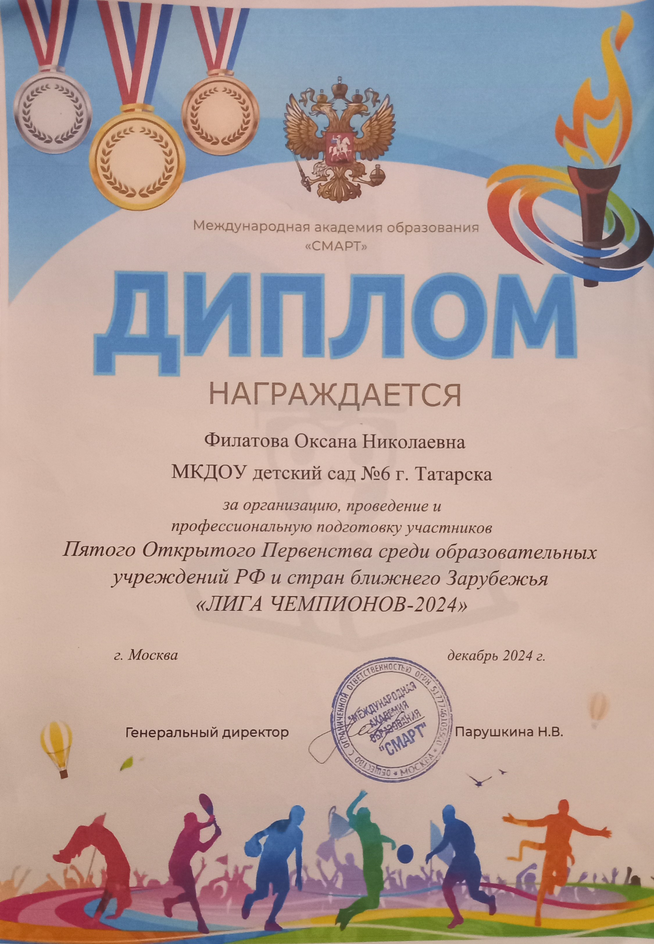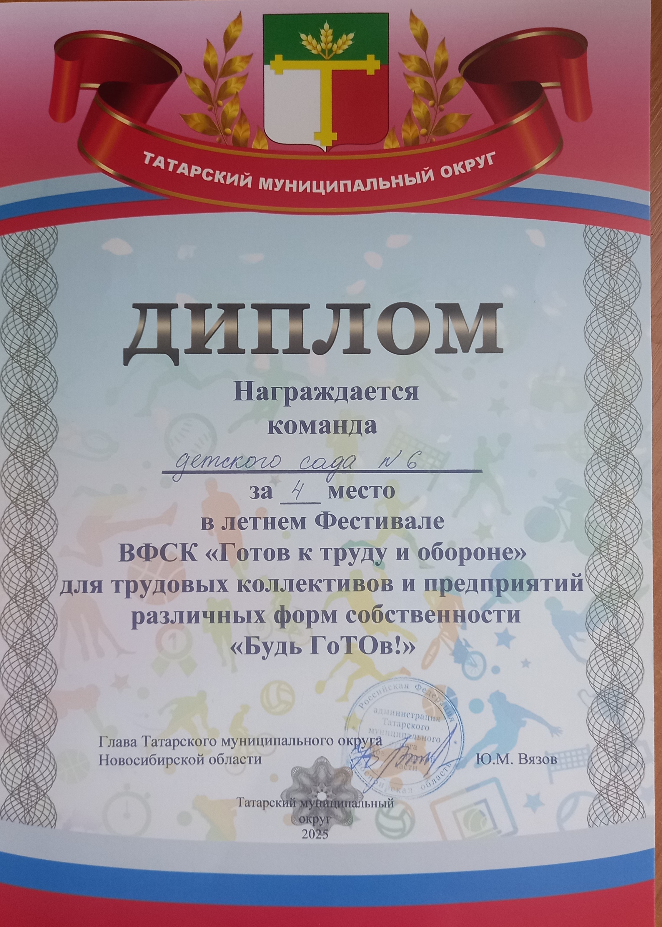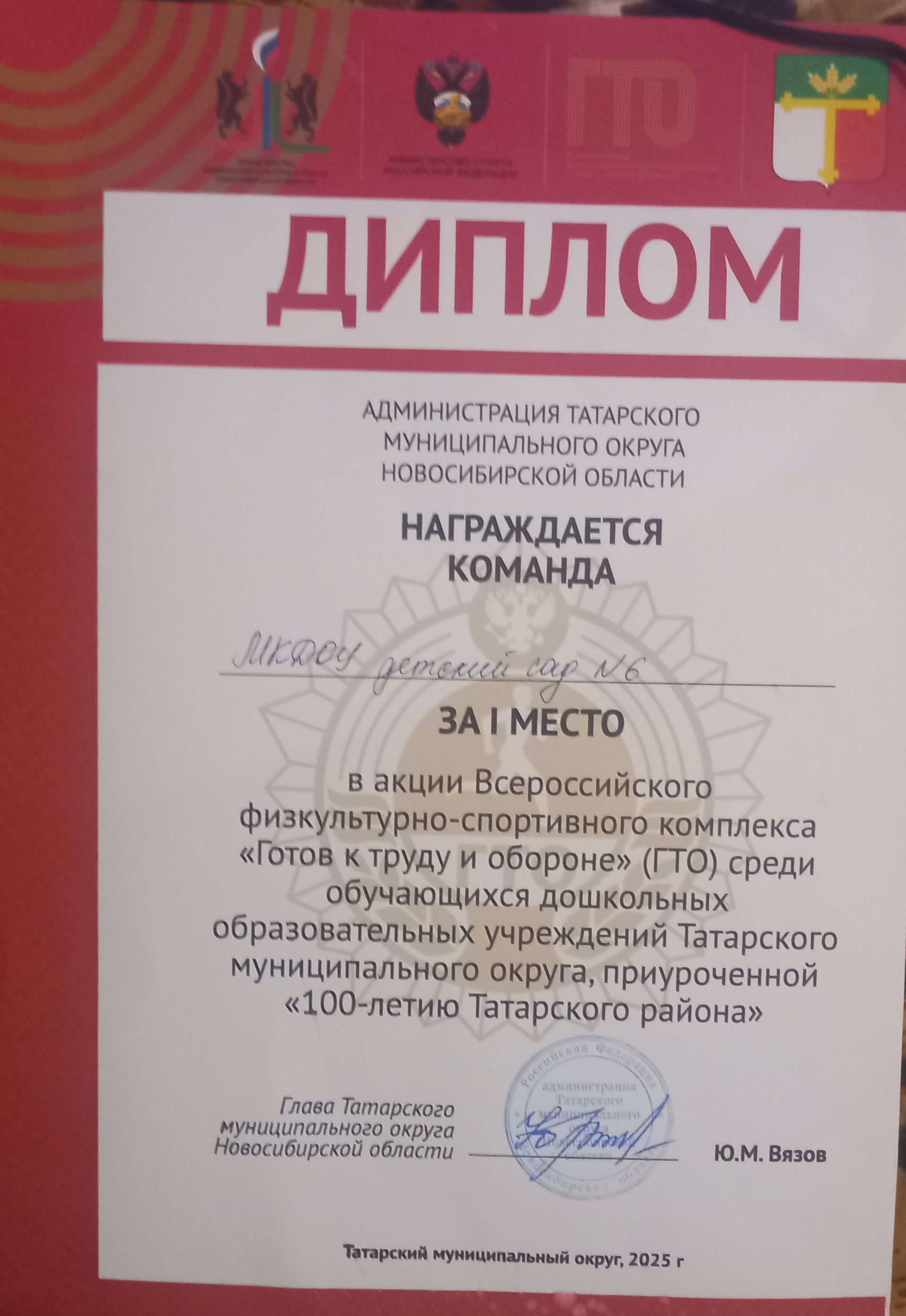 Диплом за 1 место в акции Всероссийского физкультурно-спортивного комплекса ГТО среди дошкольных образовательных учреждений Татарского муниципального округа, приуроченной "100-летию Татарского района".