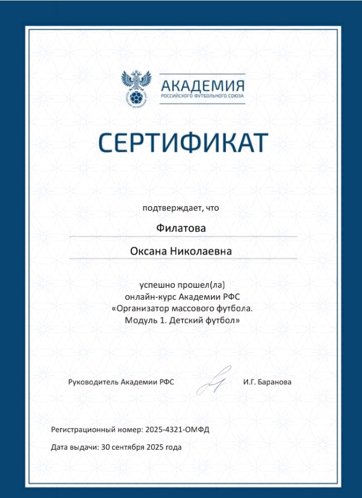 Сертификат- онлайн-курс Академия РФС "Организатор массового футбола Модуль1.Детский футбол".