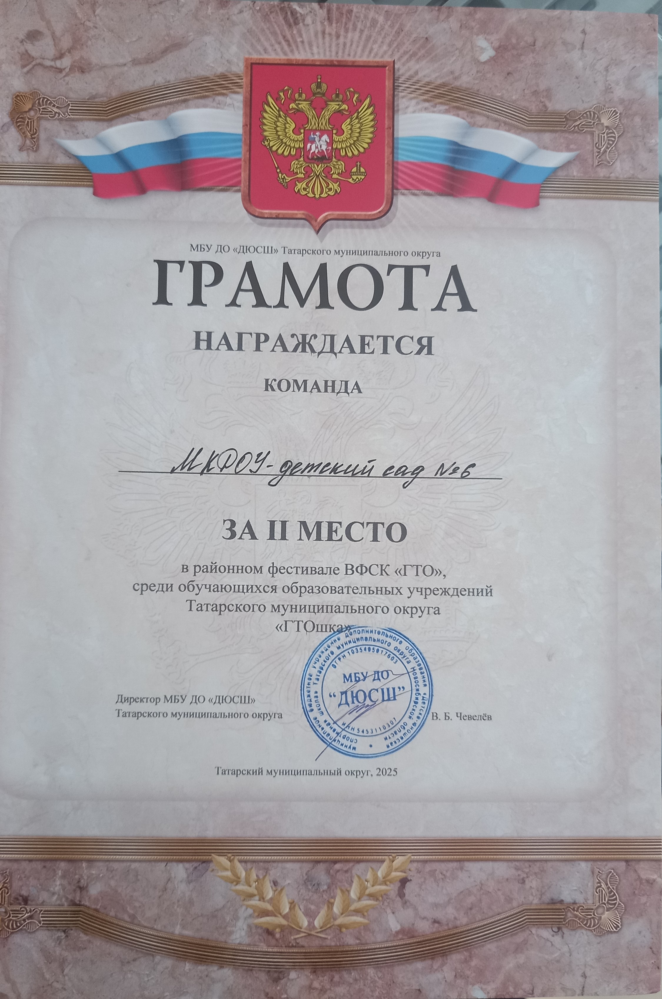 Грамота за 2 место в районном фестивале ВФСК "ГТО", среди обучающихся образовательных учреждений Татарского муниципального округа "ГТОшка".