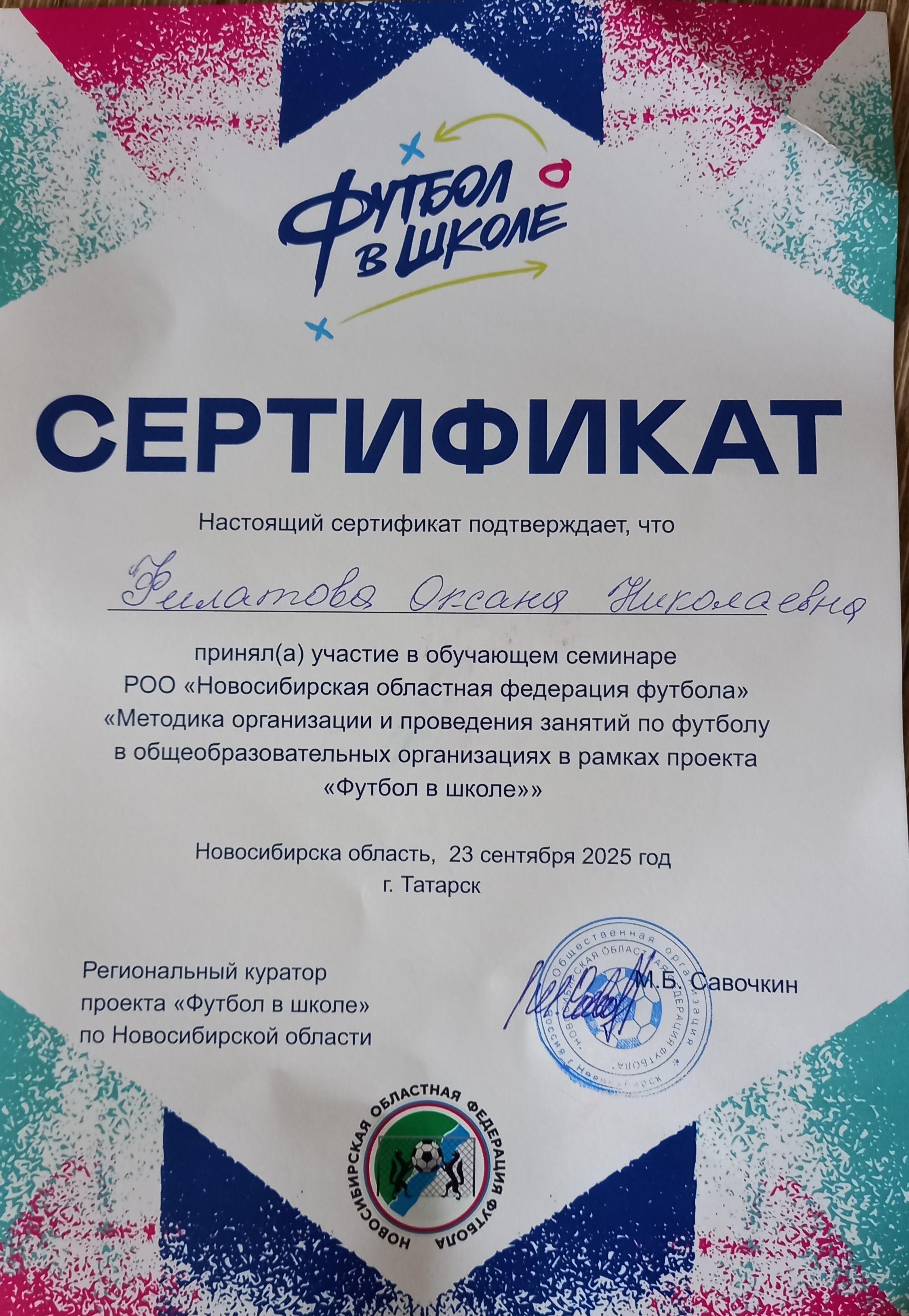 Сертификат "Методика организации и проведения занятий по футболу в общеобразовательных организациях в рамках проекта "Футбол в школе".
